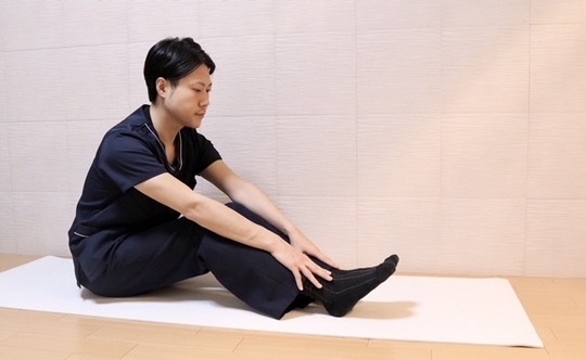1. 足をのばして背中が曲がらないように座ります。(背中が曲がる場合は必ず膝を曲げてください)