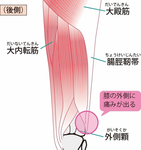 膝の後ろから見たイラストで説明します。骨盤の外側についている筋肉が膝の外側まで伸びています。この膝の外側についている靭帯『腸脛靭帯(ちょうけいじんたい)』部分が膝の曲げ伸ばしにより膝回りの骨に擦れて炎症をおこしてしまいます。これが、ランナー膝の主な痛みの原因です。