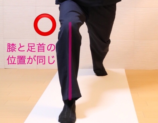 2. 踏み込んだ前の足はつま先より出ないように・かかとはしっかり床につけておくようにしましょう。