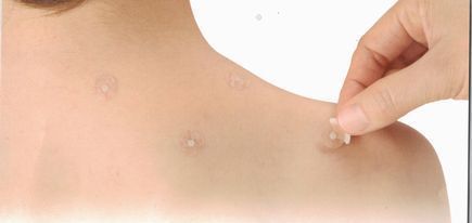 完全滅菌の鍼が貼られています。根本はしっかりと樹脂でテープに固定されており、体内に鍼が入ることはありません。