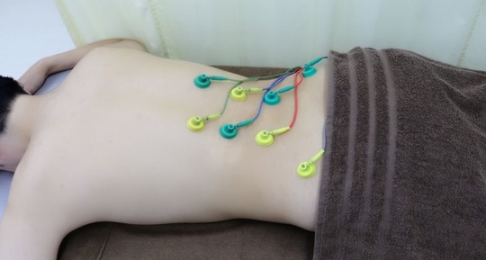 カラダの表面に専用の電極をツボに貼り付けて低周波を流す機械で、刺さない鍼のようなものです。