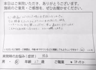 すぐには良くならないと思っていたら、次の日には痛みを忘れる位になっていました。今までも腰が痛くて色々なところに行きましたが、初めてこんなによくなりました。自分に合っている所を探すのはなかなかないのでしばらく通ってみたいと思い今も通っています。来るたびに楽になっています。