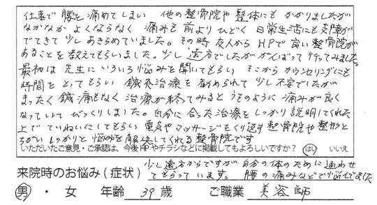 仕事で腰を痛めてしまい、他の整骨院や整体にもかかりましたが、なかなか良くならなく痛みも前よりひどく、日常生活にも支障がでてきて少し諦めていました。その時、友人からHPで良い整骨院があることを教えてもらいました。少し遠方でしたが、頑張って行ってみました。