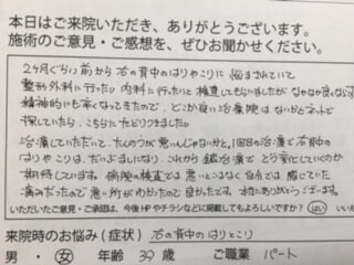 整形外科に行ったり内科に行ったりと検査してもらいましたがなかなか良くならず精神的にも辛くなってきたので、どこか良い治療院はないかとネットで探していたら、こちらにたどりつきました。