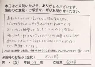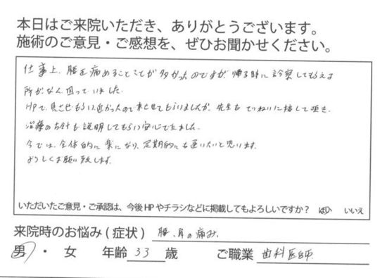 連勤のストレスから信じられない腰の痛みを感じ、すぐにでも受信したい!!と思ったのですが、祝日でどこもあいていなくて絶望していたときにホームページを発見し、予約しました。動けなくなるところをしっかり治療してもらえたので近日中にひかえていた旅行にも無事にいくことができて、とても感謝しています。