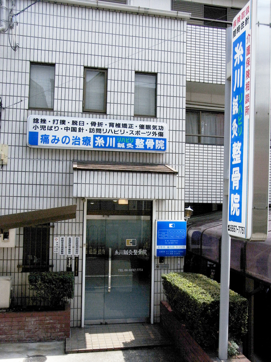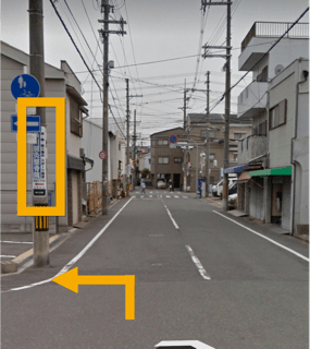 駒川商店街を抜け、約5分程度進むと左手に「月極駐車場」が見えてきます。その前の電信柱に「糸川鍼灸整骨院」の看板が出ています。