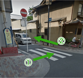 美容室に突き当たったら、右手の横断歩道を渡ります。渡ったら次は左の歩道をまっすぐ進んでください。