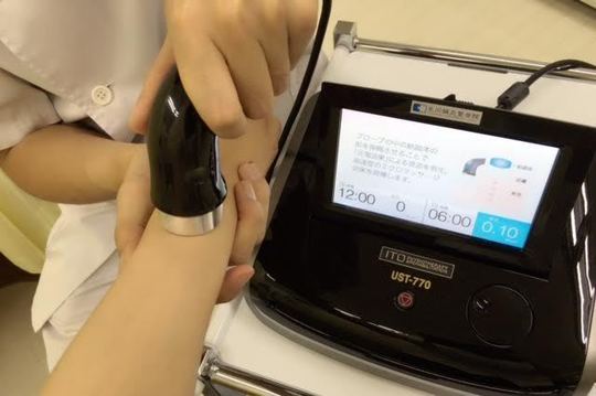 マッサージや鍼でも届かない深層の筋肉の修復を手伝ってくれるのが超音波治療器の役割です。ジェルを伸ばして上から電気を流します。悪い箇所だけがぽかぽか温められ、こちらも電気特有のビリビリかんは一切ありません。気持ちいいとさえ感じますので、鍼は怖くて出来ない方にもお勧めしています。