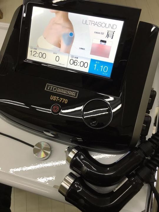 手技では届かない深層の筋肉へアプローチすることが出来るので、鍼でも届かない奥の損傷治癒を促します。ジェルを塗って超音波を流していきますが、ビリビリすることは一切ありません。よほど炎症や痛みが強い箇所の場合はほのかに心地よい温かさを感じる場合があります。主に強い痛みの除去に使っていきます。