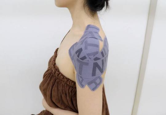 テーピングはわかりやすく簡単にいうと、もう一枚筋肉を貼り付けるような役割を果たします。首や肩、腕周りの筋肉が炎症を起こしているので、テーピングを張って周辺の筋肉の補助を行います。