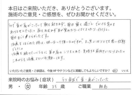 うつで首や肩がこっていて起きれず、毎日寝て過ごし出かける気力もありませんでした。夜も眠れず目が覚めたり、くよくよしたり、イライラし、毎日すごくつらかったです。