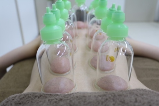 従来の吸い玉に比べ、円柱に近い形のカップを当整骨院では使用しています。お椀型の吸い玉が多く使用されていますが、吸い玉同士の距離が離れてしまうことが難点です。しかし、円柱型だと今までより近い距離に並べて吸引することが可能です。より多くの吸い玉を使用することが出来るたので吸い玉の効果を感じて頂けるかと思います。